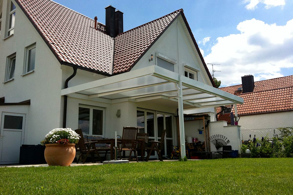 Wir empfehlen Ihnen unsere Terrassendächer mit einer Eindeckung aus Plexiglas® mit UV- und Wärmeschutzfilter. Diese vermeidet eine starke Temperaturerhöhung unter Ihrer Überdachung, und lässt Ihre anliegenden Räumlichkeiten auch weiterhin hell und freundlich erscheinen. Selbstverständlich decken wir Ihr Terrassendach auch mit VSG-Verglasung (Verbundsicherheitsglas) ein, wobei hier oft eine zusätzliche Beschattung notwendig wird.